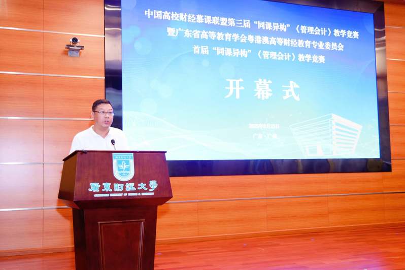 贺义梅在致辞中表示,本届“同课异构”教学竞赛以“智慧新财经”为主题、“共建共享”为宗旨,鼓励教师对同一门课程进行差异化创新与实践探索,推动财经教育高质量发展。她期待各参赛教师能够紧扣“智慧新财经”建设内核,共同探索技术赋能教育的新路径,通过本次活动,更好地推动广东财经高校与全国财经高校优秀教师深化合作。她对广东财经大学作为主办方的精心筹备表示感谢,并期望赛事促进教师交流合作,共商共建共享优质资源,惠及更多师生。预祝参赛者取得佳绩。