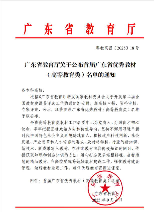 “广东省优秀教材”评选旨在选树教材建设典型标杆,打造一批适应学科前沿发展、具有示范引领作用的高水平教材,助推高等教育内涵式发展。