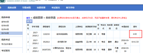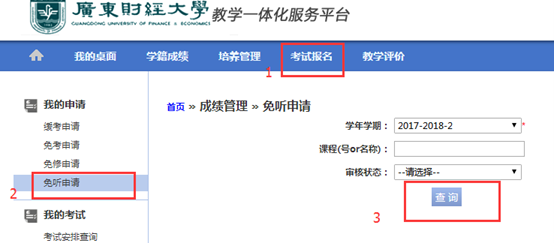 1.学生登录教务管理系统—考试报名——免听申请,选择学年学期查询。